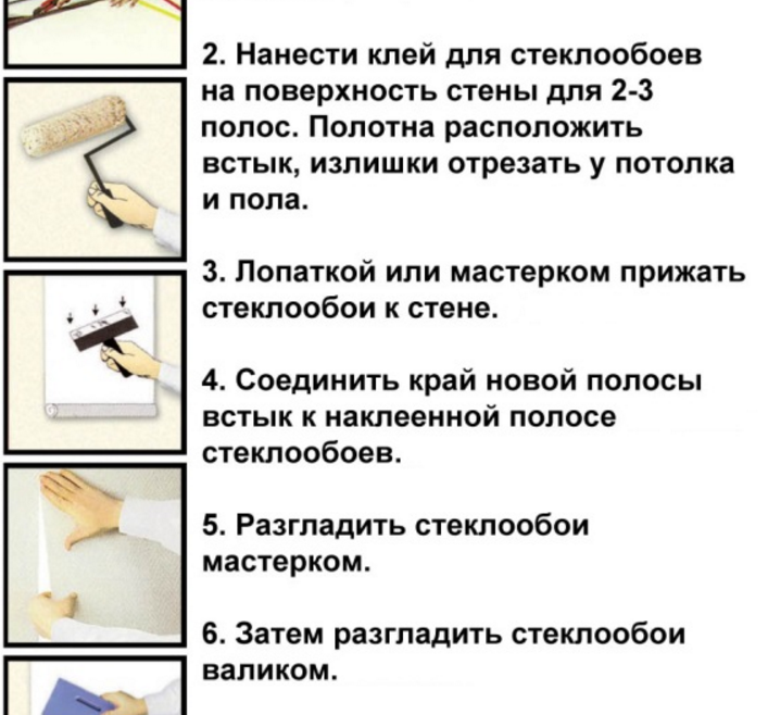 Une fois la pièce entièrement recouverte de fibre de verre, elle est laissée fermée jusqu'à ce que la colle soit complètement sèche. Habituellement, cette période dure au moins une journée. À ce stade, les courants d'air ne doivent pas être autorisés dans la pièce, sinon le mouvement de l'air entraînera un retard du matériau et la nécessité de le coller ou même de le recoller.
