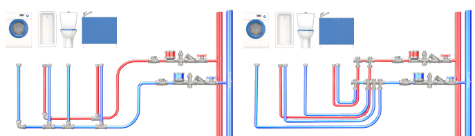 Un tel agencement de plomberie est la meilleure option pour un petit appartement, et un circuit collecteur convient à un appartement plus grand.