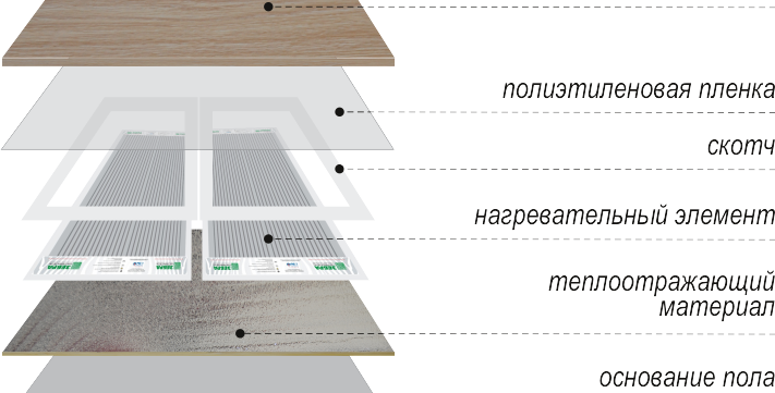 Dymsco 0510. Il a une épaisseur insignifiante de 275 microns et une puissance suffisante - 140 W / m2. Dans la production, une technologie unique a été utilisée, qui inclut une feuille stratifiée de polymère dans la composition du film, sur laquelle une pâte de carbone capable de conduire le courant est appliquée. Mais dans une plus large mesure, cette option convient comme source de chaleur supplémentaire dans la pièce.
