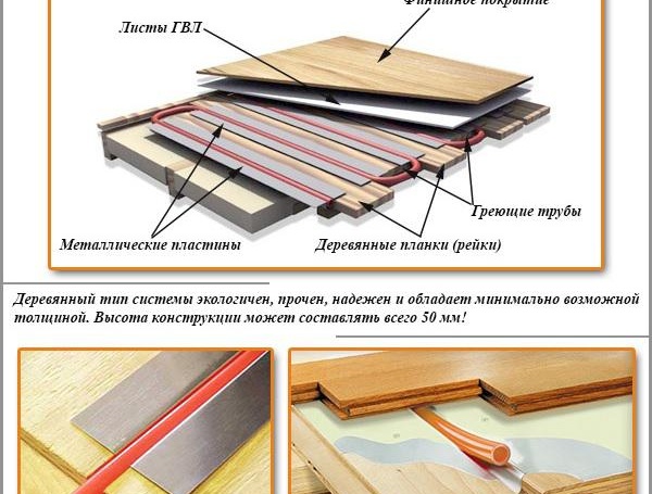 - En bois. Des plaques de bois sont utilisées ici, sur un côté desquelles se trouvent des canaux spéciaux où sont placés les tuyaux.Ce système peut être monté de la même manière que le polystyrène.