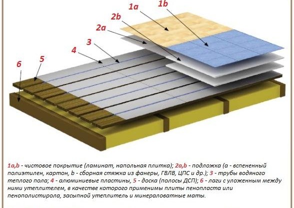 Matériel pour isolation nécessite la pose de plaques métalliques avant que les tuyaux du système de plancher chauffant à l'eau ne soient localisés. Il vaut toujours la peine de s'en tenir au plan prévu. Après cela, un substrat est posé sur le dessus, le long duquel une finition est disposée. Pour les revêtements autres que parquet et stratifié, certaines règles doivent être respectées. Sous le carrelage, une chape sèche est constituée de feuilles de contreplaqué, de plaques de plâtre ou de panneaux de particules.