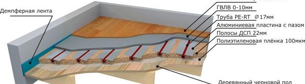 Lorsque nous avons une base en bois devant nous, des plaques d'acier galvanisé sont posées dessus. Vient ensuite pose du substrat en polyéthylène pour éviter la fissuration des planches de parquet après leur pose. Si le linoléum ou les carreaux de câble sont utilisés comme revêtement après l'installation d'un sol à eau chaude, les feuilles GVL sont les plus populaires comme substrat.
