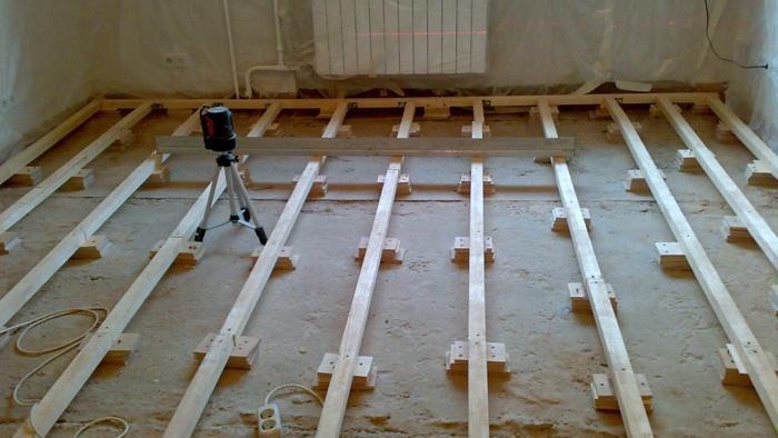 - Diagnostic approfondi et examen du plancher existant et de tous ses éléments (planches, rondins, supports, etc.). Si des composants de sol suspects sont identifiés, ils doivent être remplacés. Après le remplacement, tous les éléments en bois doivent être soigneusement traités avec un antiseptique pendant éviter la formation de moisissures, champignons, et, par conséquent, la destruction de la structure en bois.