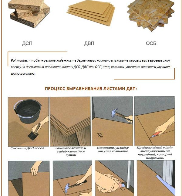 Une méthode avec une vaste expérience dans l'application et l'utilisation - feuilles de contreplaqué pour créer une surface plane. Dans ce cas, il est possible non seulement de coller du contreplaqué ensemble, de le monter avec ou sans pose de bûche, mais aussi d'utiliser du contreplaqué "réglable". Il ne devrait y avoir aucune question sur la façon de niveler le sol de l'appartement de vos propres mains à l'aide de contreplaqué. Le processus est assez simple et ne nécessite pas de connaissances sérieuses.