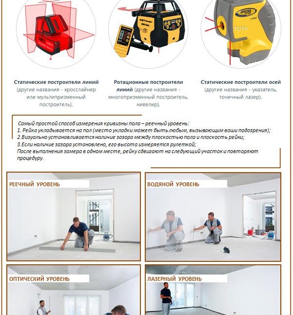 La base de tirage, ainsi que sa courbure, affecteront l'état général du sol après l'achèvement chapes. Pour cette raison, des mesures de l'horizon du sol doivent être effectuées. Pour ce faire, vous devrez utiliser des outils spéciaux, comme un niveau hydraulique ou un niveau laser. Pour les petits espaces, le niveau de construction habituel convient également. Mais la longueur ne sera pas toujours suffisante pour une mesure complète. Dans ce cas, vous pouvez placer une règle en dessous, sur la partie supérieure de laquelle un niveau est placé.