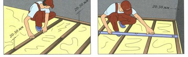 En ce qui concerne la pré-installation du décalage, le sol est généralement réalisé à partir de zéro. Les bûches sont attachées avec un niveau, en choisissant la hauteur exacte. Des vis autotaraudeuses sont utilisées pour la fixation.