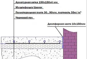 Pour l'assurance, les coutures sont faites tous les 20 m2 zone de la chambre. Ils ne permettent pas à la chape de se fissurer en raison des fluctuations constantes de température. La chape rugueuse évite de tels événements, car entre chauffage par le sol et elle a une couche d'isolant pour éviter cela.