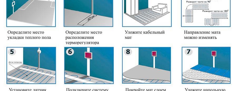 Convient aux pièces où il n'y a aucune possibilité d'effectuer Chape en béton épaisseur requise. Le câble chauffant en tapis a une petite épaisseur d'environ 3 mm, qui est fixé sur le treillis en fibre de verre. Le pas standard pour la pose du câble chauffant au sol est de 50 à 70 mm, qui est connecté au thermostat aux extrémités. Le plus souvent, les tapis sont installés avec des thermostats à réglage manuel. Vous pouvez également utiliser des dispositifs de programmation, où un programme spécifique pour chauffer l'air de la pièce est défini (par jour, semaine, etc.).