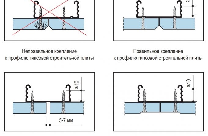 La fixation des panneaux de construction en gypse et des plaques de fibres de gypse aux profilés (barres) s'effectue principalement sur les profilés de support. Pour faciliter le masticage ultérieur, il est recommandé de prédécouper les feuilles jouxtant le côté long du mur