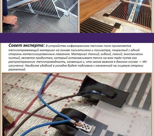 En dessous de film de chauffage au sol, disposés sous un stratifié, il est préférable d'utiliser un substrat sous forme de mousse de polyéthylène ou de polypropylène. Il est recouvert d'un film de lavsan ayant une couche métallisée. Tout cela permet de répartir uniformément la chaleur sur toute la surface.