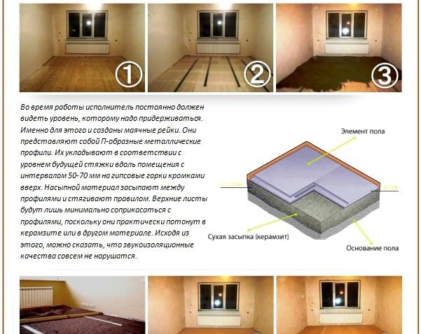 - Ils augmentent l'isolation phonique des plaques de polystyrène expansé posées au sol. Au lieu de cela, vous pouvez remblayer à partir d'un mélange sec sous forme d'argile expansée.