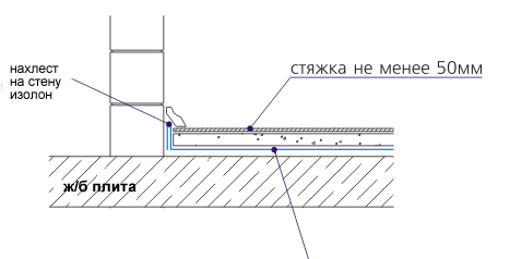 - Isolant. C'est-à-dire à délimiter d'autres structures existantes. Ainsi, la tension est supprimée, ce qui pourrait se transmettre les uns aux autres. Même une chape semi-sèche ne doit pas appuyer sur le mur, pour lequel un ruban amortisseur est utilisé. Des coutures sont réalisées autour de chacun des éléments (colonnes, évidements, murs).