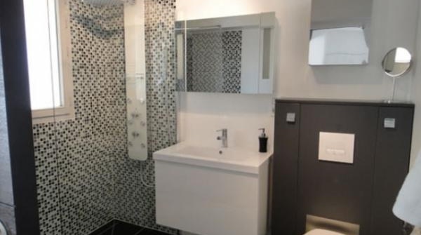 - Cette option est bonne pour planifier une petite salle de bain combinée, dans laquelle un mur est beaucoup plus long que l'autre, c'est-à-dire que la forme de la pièce est un rectangle. D'un côté de la pièce, une petite, une cabine de douche est installée, jusqu'à 140 cm de long, en face, d'autre part, il y a une table de lavabo spéciale dans tout le mur. Un tel meuble peut contenir plusieurs éviers à usages divers. Juste en face de la porte d'entrée, située sur le mur le plus long, ils installent une cuvette de toilettes et accrochent un sèche-serviettes. Les inconvénients de cette option pour planifier une salle de bain sont l'impossibilité d'installer une salle de bain, car il n'y a pas assez de longueur de mur pour cela. Cependant, il y a des avantages agréables : la cabine de douche sera beaucoup plus spacieuse que ses modèles standard ; une armoire-table avec lavabos ajoutera du piquant à l'intérieur, et son large plateau remplira une fonction pratique.