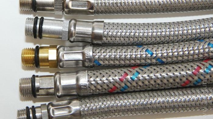 - La laisse d'eau flexible renforcée est fabriquée avec une tresse en nylon. Durée de vie - jusqu'à 15 ans, pression maximale 20 atmosphères, température maximale - 110 degrés. De tels eye-liners, bien qu'ils soient de meilleure qualité, sont rarement utilisés, car généralement les conditions pour lesquelles ils sont adaptés sont rares.
