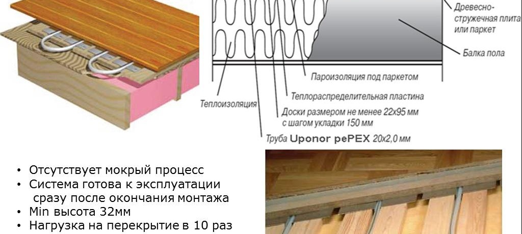 Une autre option qui peut être organisée plancher chauffant à l'eau sans chape - plancher en bois. Il est le plus souvent aménagé dans des bâtiments en bois. À sa base, un module spécial peut être sélectionné ou il peut être posé sur une base de rack. Ces deux options sont fondamentalement identiques. La différence réside dans ce qui est utilisé lors de l'installation.Pour un système modulaire - modules prêts à l'emploi sous la forme d'une planche de bois, avec rainures intégrées pour une pose de tuyaux de haute qualité. Pour rack - planches ou lattes.