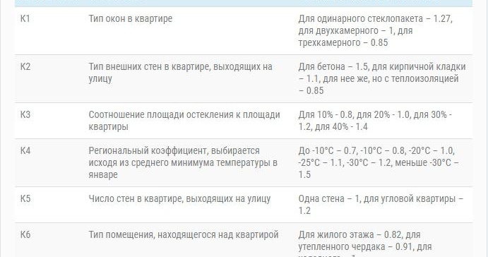 D'après la formule présentée, S est compris comme la zone de l'appartement qui nécessite un apport de chaleur, K - multiplicateurs qui doivent être appliqués en fonction de certaines circonstances. Une attention particulière doit être portée au tableau présenté, qui montre quoi et comment compter. R est la puissance de réserve de la chaudière de chauffage, choisie dans la plage de 1,15 à 1,25, P est la puissance moyenne requise par mètre carré.Ces données permettront de recevoir le chauffage moderne des maisons et des appartements.