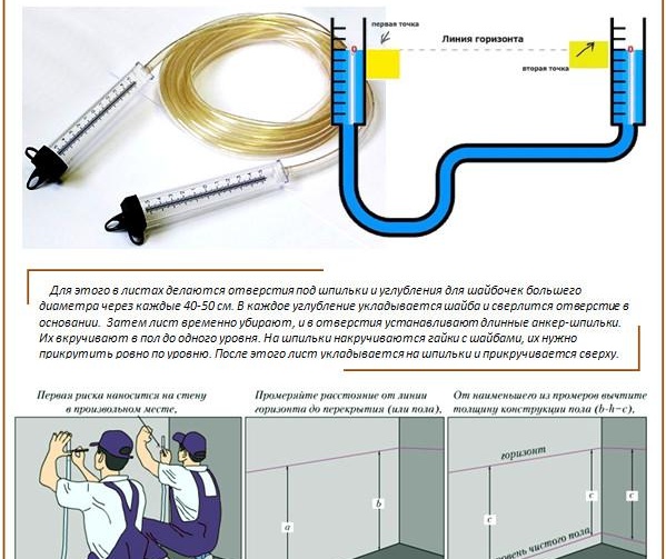 Jusqu'au moment où couler le sol mortier, le niveau et l'épaisseur de la couche doivent être déterminés. Il est impossible de le faire de vos propres yeux. Des outils spécialisés doivent être utilisés dans les travaux. Les saillies et les nids-de-poule à la surface sont déterminés à l'aide d'une barre et d'un niveau. Plus la barre est longue, plus les résultats sont précis. Il existe des moyens plus modernes pour effectuer ce type de travail.