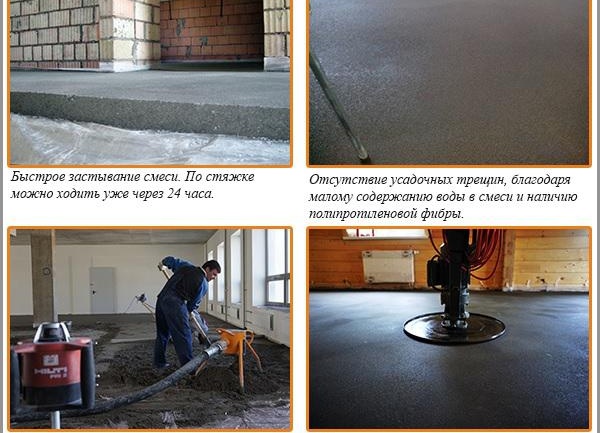 - Mise en place rapide. Après la pose d'une chape semi-sèche de cette manière, l'eau s'évapore très rapidement en raison de sa faible quantité. Même après 1 à 2 heures, lorsque vous utilisez un équipement spécial, vous pouvez vous déplacer sur la surface de la chape inondée. Ceci est nécessaire pour effectuer le jointoiement. L'ensemble du processus technologique jusqu'à la pose du revêtement de sol prend un temps très court.