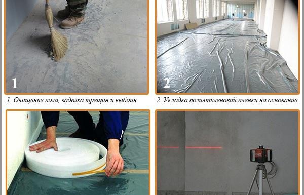 Le remplissage de la chape de manière mécanisée est effectué par des entreprises de construction spécifiques. Ils ont la bonne dose de technologie. Au stade initial, la base est préparée pour le travail: tous les débris disponibles, la poussière, tout ce qui peut interférer est éliminé. Il ne sera pas superflu de le traiter avec une solution de sol. Par la suite, une couche de bruit et d'étanchéité est disposée. Pour cela, un substrat en polyéthylène est posé. Son épaisseur sera suffisante en 5-10 mm.