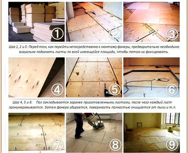 Toutes les chevilles disponibles sont rarement obstruées et un espace est laissé entre chacune des feuilles de matériau, qui est ensuite scellé avec du ruban de plomberie. Un espace similaire est laissé entre le mur. Ce sera suffisant pour 1 cm En plus des sols en béton, le contreplaqué peut être parfaitement nivelé et ancien socles en bois.