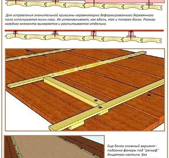 - Installation d'un mini-décalage. Les dispositifs en contreplaqué pour le nivellement sont autorisés dans le cas où la différence de hauteur est jusqu'à 80 mm.Le processus d'installation est assez compliqué et comprend la fixation des rails, ainsi que des planches en bois. Avec leur aide, un réseau unique de supports pour les futures feuilles est réalisé. Dans ce cas, il est très important de faire des calculs précis afin que la tâche soit accomplie avec une efficacité maximale. Chaque élément a sa propre hauteur et sa propre taille, qui sont également calculées lors de la préparation.