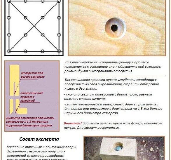 Lorsque tout ce qui précède est fait, vous pouvez niveler le sol contre-plaqué. Pour la fixation des feuilles, l'un des schémas ci-dessus est sélectionné. Il ne sera pas superflu de traiter chaque élément de contreplaqué avec un antiseptique. La fixation se fait généralement avec des vis autotaraudeuses avec des chevilles en plastique. C'est pour que la feuille de contreplaqué ne se fissure pas que des trous sont pré-percés.