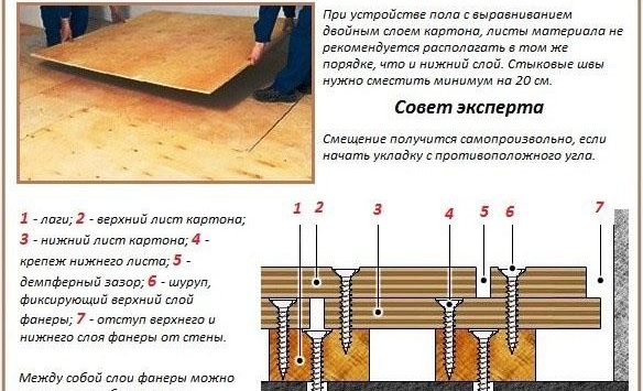 Ensuite, les feuilles sont disposées au sol et il ne sera pas superflu de numéroter chacune d'entre elles afin de ne pas confondre. Il convient de noter qu'en cas de décalage, tous les joints de feuilles de contreplaqué doivent être situés dans ces zones.