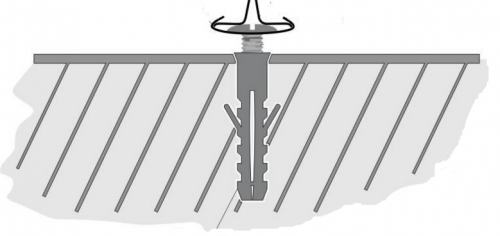 Une fois l'installation des chevilles terminée, des vis autotaraudeuses y sont installées (avec les têtes alignées dans le même plan) et les fixations des balises «Kremmer» sont directement installées. Dans ce cas, vous devez vous concentrer sur le "point zéro", en alignant le calque de manière à ce que son plan chevauche ce point de repère. En conséquence, le mur est aussi lisse que possible et moins de plâtre est consommé.