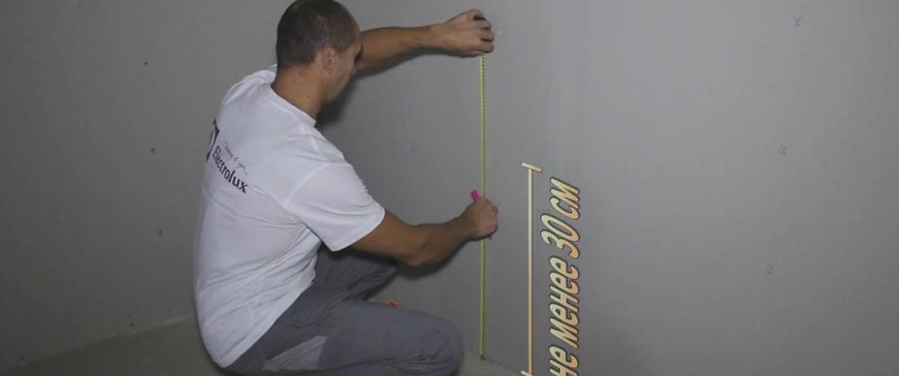 - Détermination de l'endroit où se trouve le thermostat. Il se fixe comme un interrupteur normal. La distance la plus optimale par rapport au sol est de 30 cm, cela n'a aucun sens de l'installer en dessous. En plus de percer un trou dans le mur pour thermostat, un trou est également fait à partir de celui-ci perpendiculairement à la base du sol, où seront placés le fil d'alimentation et les autres fils de l'ondulation.