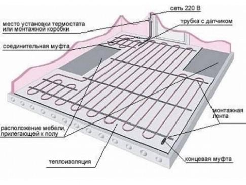 Toutes les lignes du câble chauffant ne doivent pas être connectées ou croisées les unes avec les autres. Sur toute la surface de la pièce, l'étape de pose, qui est présélectionnée, doit être maintenue. Dans les zones où il est nécessaire de plier le câble, son rayon doit être supérieur à 50 mm. Les deux câbles chauffants du sous-plancher doivent être fixés au thermostat installé.